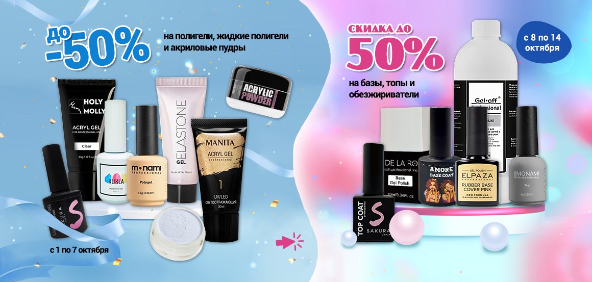 1. Скидки до 50% на полигели, жидкие полигели и акриловые пудры.