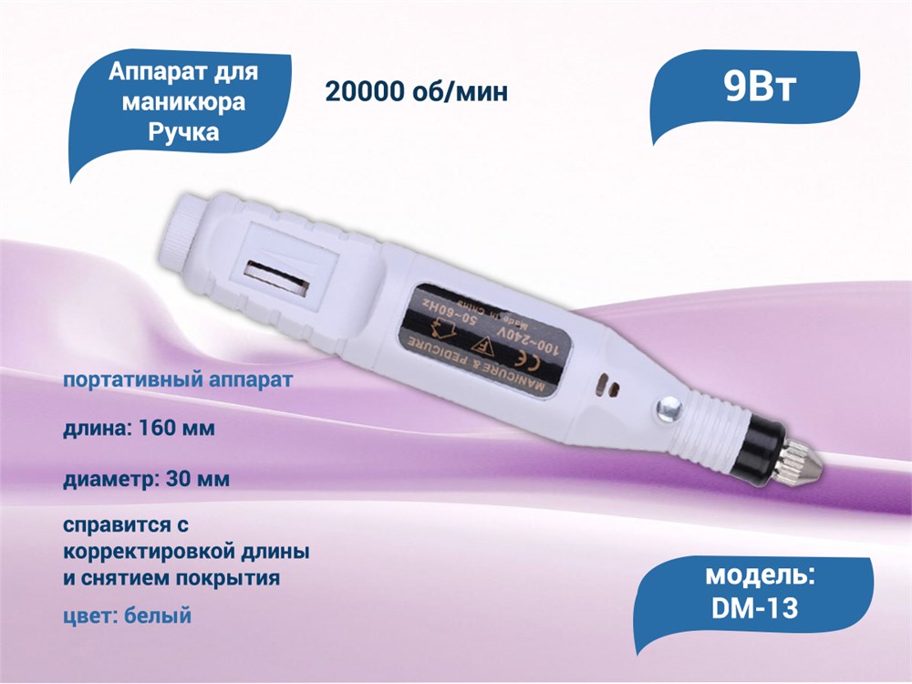 Портативный аппарат для маникюра в виде ручки удобно брать в путешествия, т.к. весит он всего 120 гр и имеет размер 16х3 см. Он легко справится с маникюром, корректировкой длины и снятием покрытия. Подходит для любых фрез стандартного диаметра – 2,4 мм. Работает от сети, блок питания идет в комплекте.