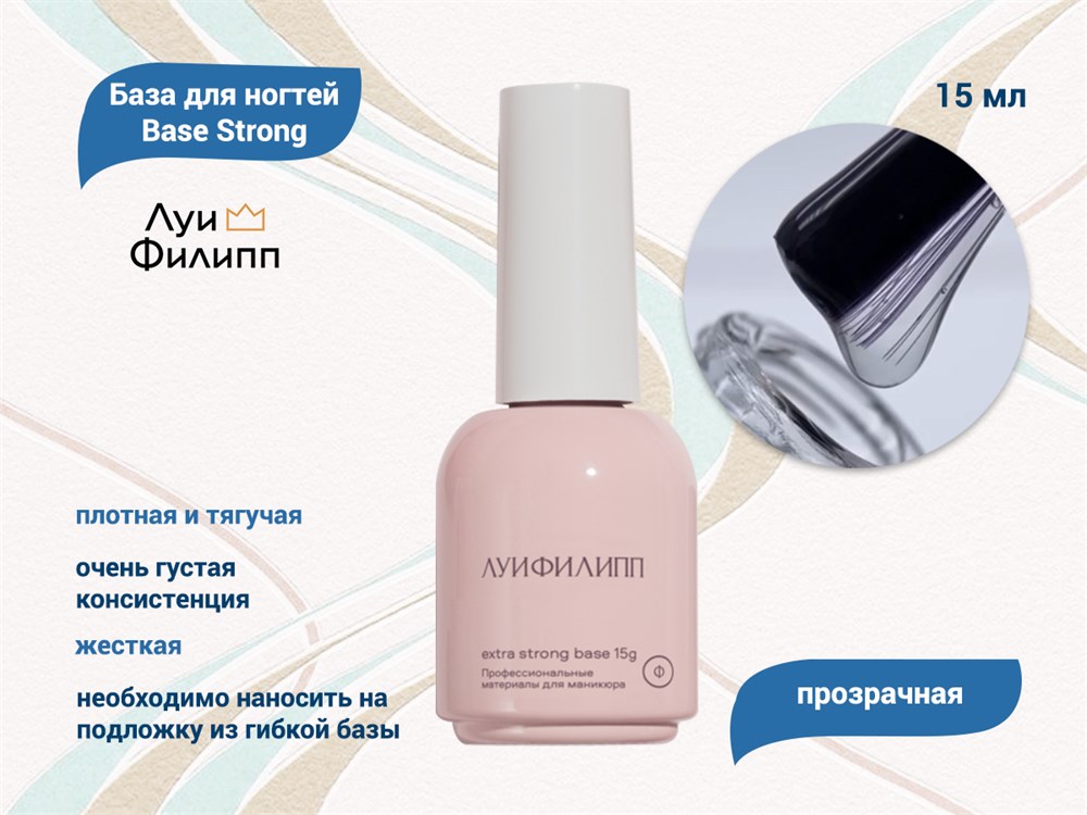 )Очень густая плотная тягучая база Strong Луи Филипп, предназначенная для выравнивания и укрепления ногтевой пластины. Данный материал необходимо наносить на предварительно подготовленный и обезжиренный ноготь. Обратите внимание, что базовое покрытие с пометкой Strong - жесткая, ее нужно наносить на подложку из более гибкой базы.