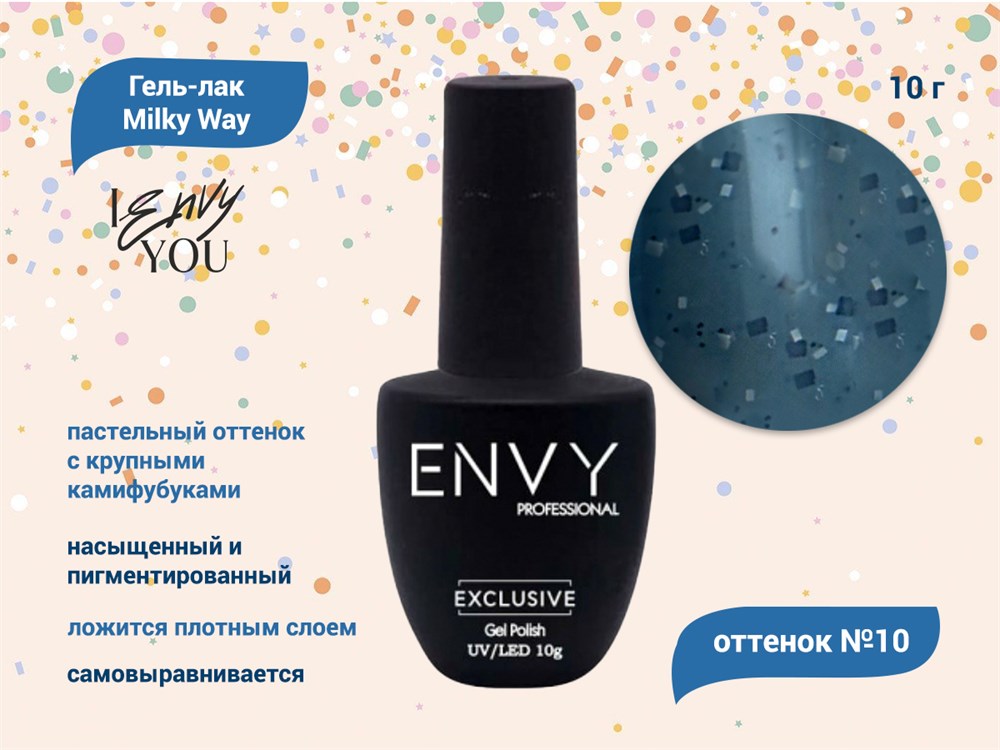 Гель-лаки для ногтей имеют пастельные оттенки с крупными камифубуками квадратной и шестигранной формы, которые не топорщатся и аккуратно наносятся на ногтевую пластину. Покрытие отличается насыщенностью, благодаря чему наносится в один-два слоя, прекрасно самовыравнивается.