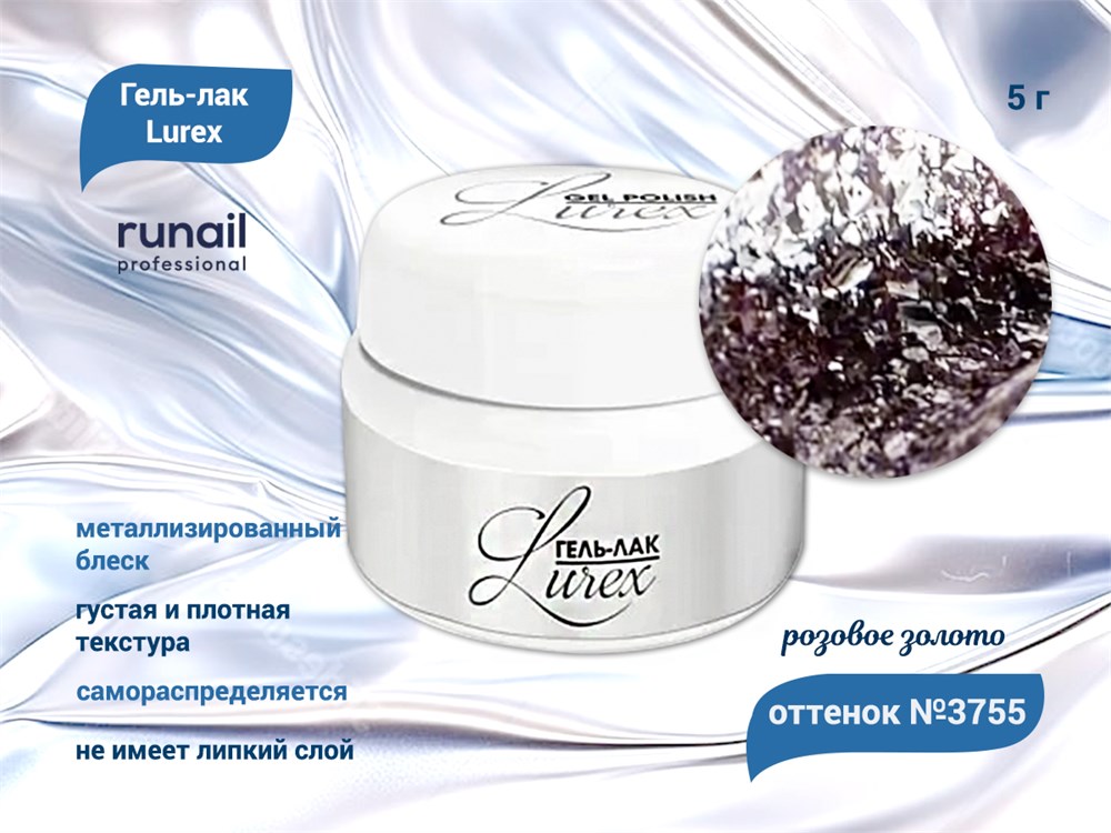 )Гель-лак RuNail, Lurex обладает ярким металлизированным блеском за счет огромного количества мелких глиттерных блесток. Придает ногтям стильный эффект и позволяет создавать роскошные дизайны. Густая и плотная текстура напоминает гель, поэтому гель-лак можно наносить в один слой и рисовать вензеля. Имеет липкий слой.