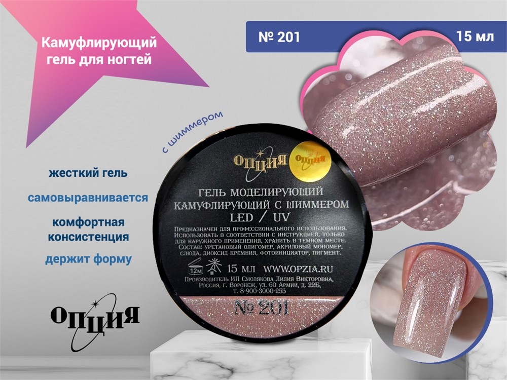 Камуфлирующий самовыравнивающийся гель для ногтей "Опция" №201, с шиммером, 15 мл