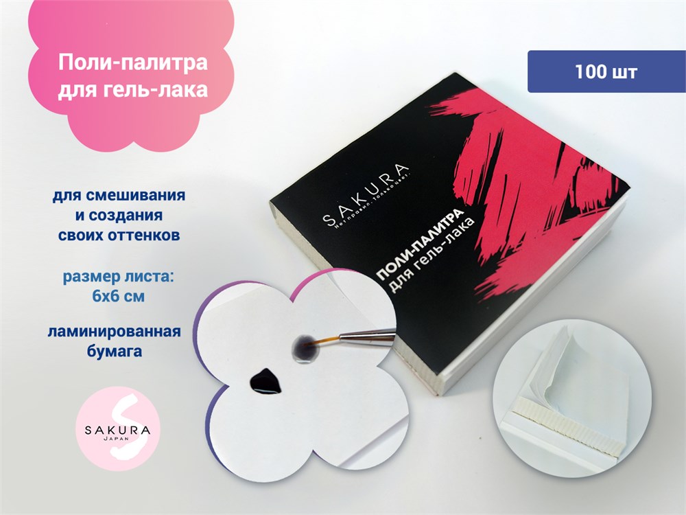 Поли-палитра для гель-лака (от англ. poly — много, и palette — палитра) — это специальный инструмент для смешивания и создания собственных оттенков, а также для удобного забора материала во время работы. Наша палитра выполнена в форме блокнота, её ключевое свойство — к ней не прилипает и не впитывается любой материал для наращивания и покрытия ногтей. Палитра тм Sakura – это 100 листов ламинированной бумаги размером 6х6 см.