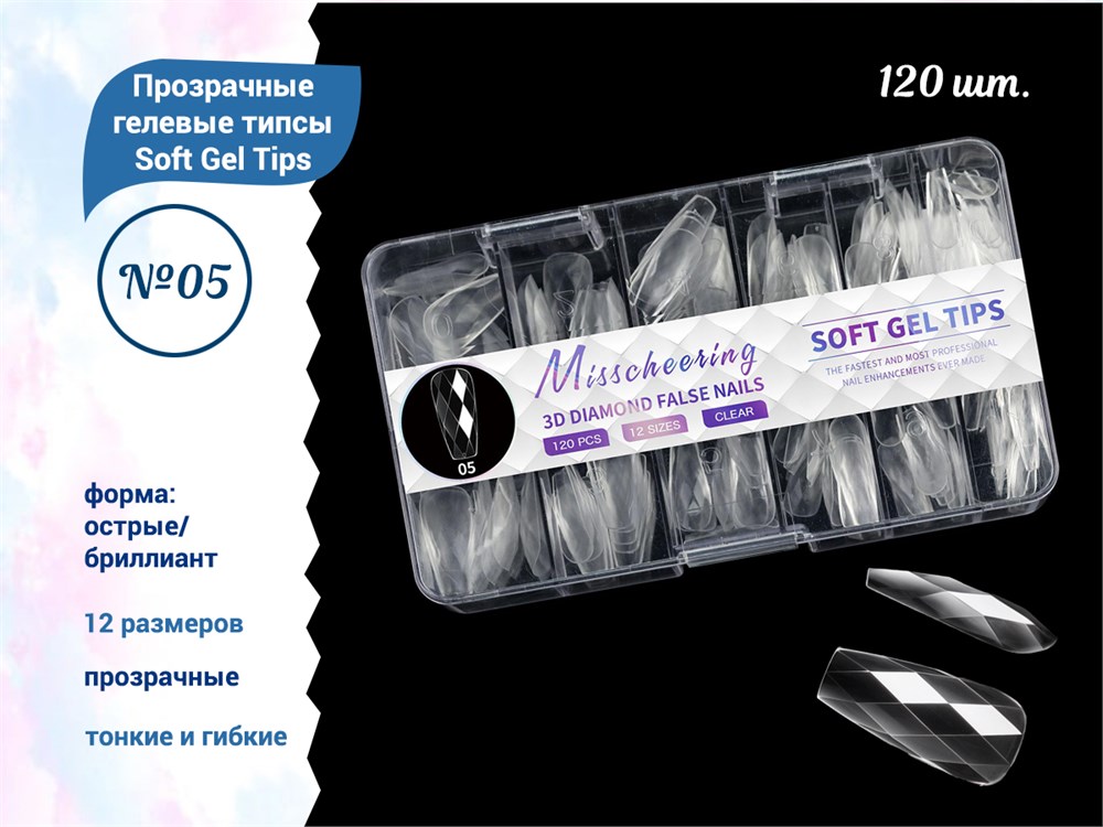 Прозрачные гелевые типсы Soft Gel Tips №10 балерина/бриллиант, 120 шт (12 размеров)