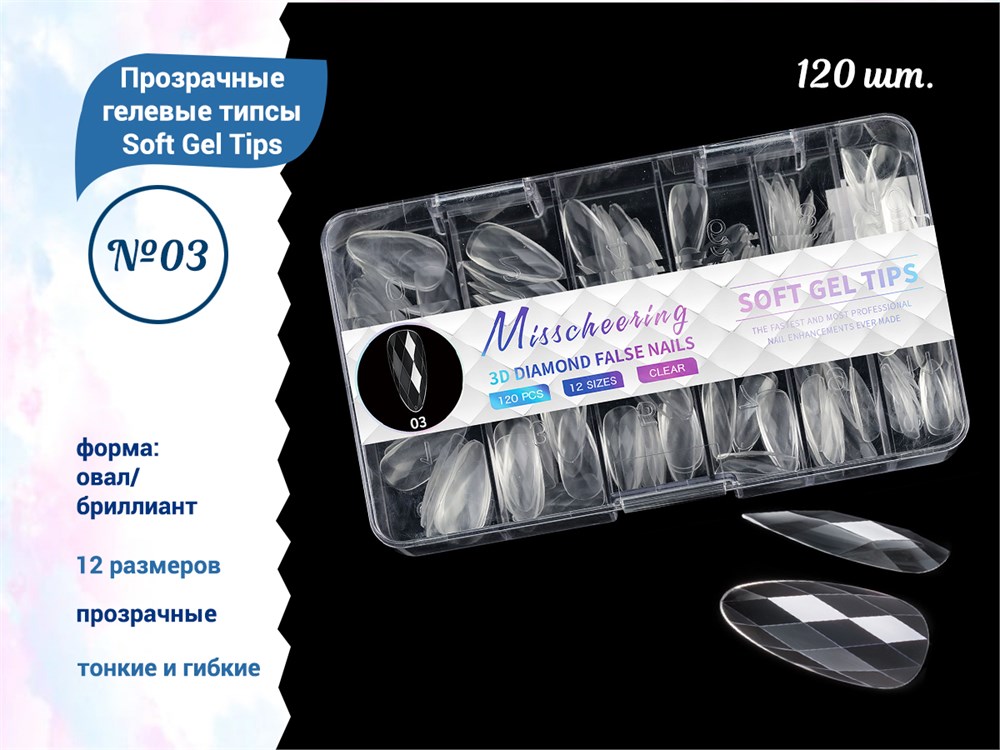 Прозрачные гелевые типсы Soft Gel Tips №12 овал/бриллиант, 120 шт (12 размеров)